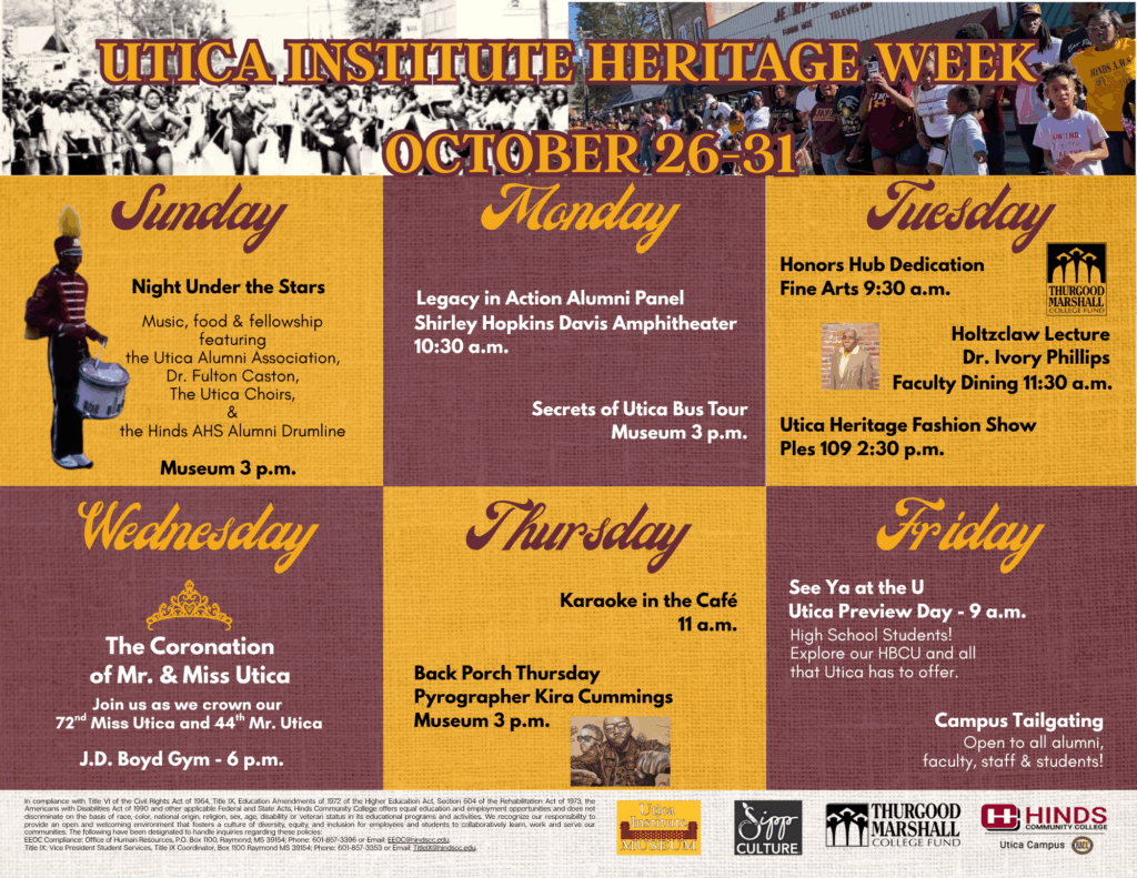 Join us October 26th-31st for Utica Institute Heritage Week, as we gather friends and alumni together to celebrate the legacy of Utica! The campus has planned a full slate of events, including the coronation of Mr. and Miss Utica. We hope you will join us for the week’s activities!